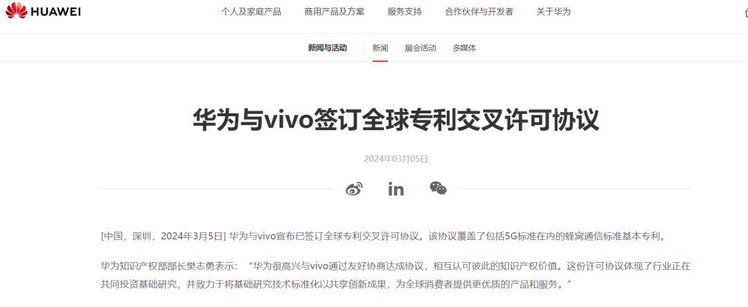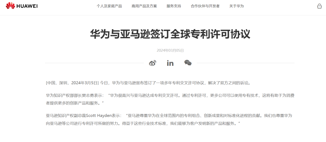 3 月 5 日,华为宣布与 vivo 签署一项全球专利交叉许可协议,涵盖包括 5G 在内的蜂窝标准必要专利。与此同时,华为也宣布与美国企业亚马逊签署了一项多年专利交叉许可协议,解决了双方之间的未决诉讼。