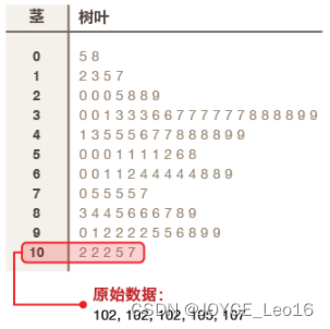 茎叶图 (Stem & Leaf Plots) 又称为「枝叶图」,是一种按位数 (place value)组织数据的方法,可用来显示数据分布。