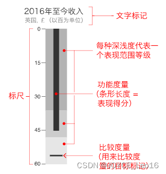 子弹图 (Bullet Graph) 的功能类似于条形图,但加入更多视像元素,提供更多补充信息。