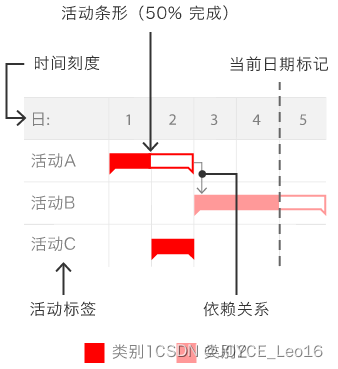 甘特图 (Gantt Chart) 通常用作项目管理的组织工具,显示活动(或任务)列表和持续时间,也显示每项活动何时开始和结束。
