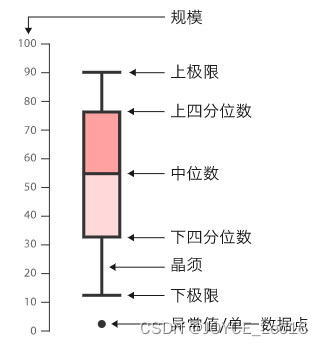 从盒子两端延伸出来的线条称为「晶须」(whiskers),用来表示上、下四分位数以外的变量。异常值 (Outliers) 有时会以与晶须处于同一水平的单一数据点表示。