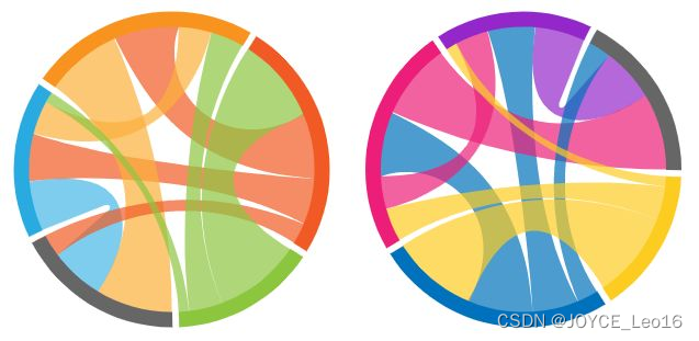 弦图 (Chord Diagram) 可以显示不同实体之间的相互关系和彼此共享的一些共通之处,因此这种图表非常适合用来比较数据集或不同数据组之间的相似性。