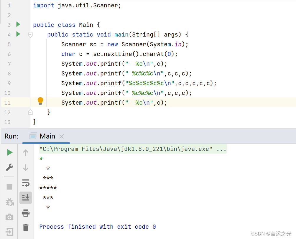 给定一个字符,用它构造一个对角线长5个字符,倾斜放置的菱形。