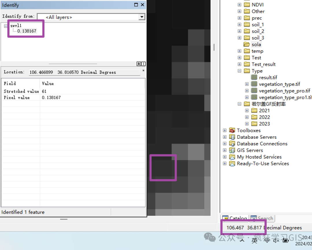 那么这个像素值对不对呢?我们可以在ArcGIS中打开这个.nc文件的第一景数据,找到代码中目标经、纬度(也就是longitude_need和latitude_need所指向的数据)所对应的像元,并查看其像素值;如下图所示。
