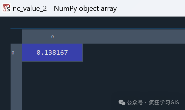其次,是第二种需求。前面我们提取了指定时间维下的所有经度和纬度位置的值,那么现在就更进一步,提取指定时间维度、经度维度以及纬度维度的数据(相当于就是从前面的一景数据变成了一个像元的数据)。首先,我们指定一个处于.nc文件成像范围内的目标经度longitude_need和目标纬度latitude_need,并使用argmin()函数找到目标经、纬度值与文件中经度、纬度的维数据值最接近的索引值——即longitude_nc和latitude_nc。最后,即可使用nc_data.variables["swvl1"][time_need, latitude_nc, longitude_nc]来获取特定时间、经度和纬度位置的值,并将结果存储在nc_value_2变量中。