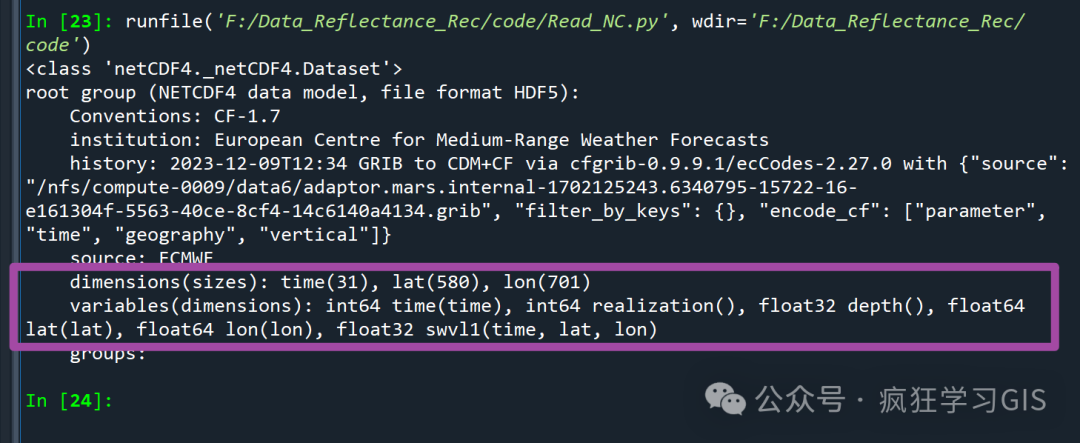 其中,在上图我们需要重点关注紫色框内的内容。首先,在dimensions中,我们可以看到所有的维;我这里的.nc格式数据是一个表示气象的数据,所以文件中的维依次就是时间、纬度与经度;随后,在variables中,我们可以看到所有的数据变量(这里的数据变量是包含了维、变量与其他参数)——其中我们重点观察数据中的因变量(也就是上图中的swvl1),需要留意一下其后不同维的排序顺序,在后面我们按照维提取变量数据的时候会用到。