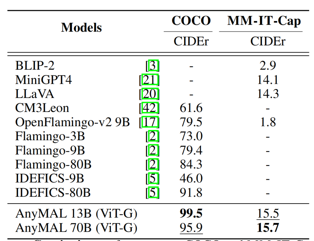 在COCO和MM-IT数据集上评估了零样本图像字幕性能。AnyMAL在两个数据集上的性能都显著优于基线模型,表明其在视觉理解能力上的优势。