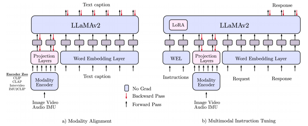 图2 AnyMAL训练过程。(a)模态对齐预训练允许通过投影层将每个模态编码器的输出映射到联合LLM嵌入空间中。(b)通过多模态指令调优,该模型学习了将系统指令和文本查询与输入的多模态上下文关联起来。