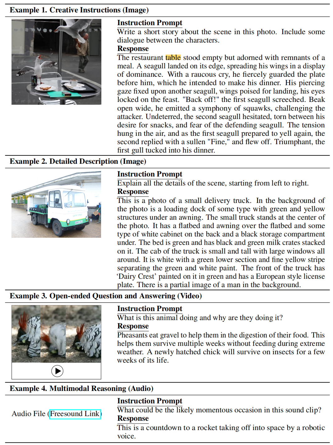 表1 本文自建的MM-IT数据集的示例数据,手动收集的指令提示和针对不同模式(即图像、视频和音频)的响应对。