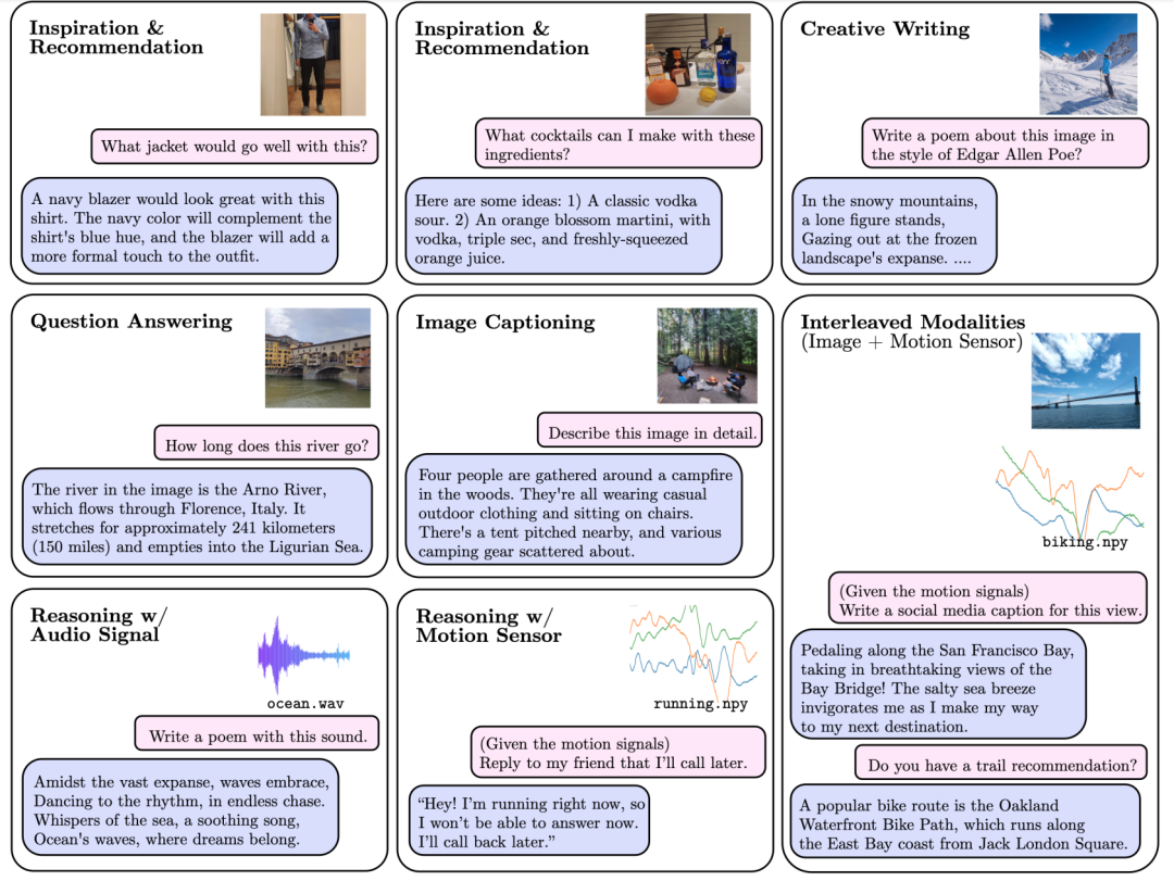 图1 AnyMAL输出示例。该模型理解各种模态的输入信号,并响应自由形式的用户查询。当多个模态交错并作为输入时,模型将对它们进行联合推理。