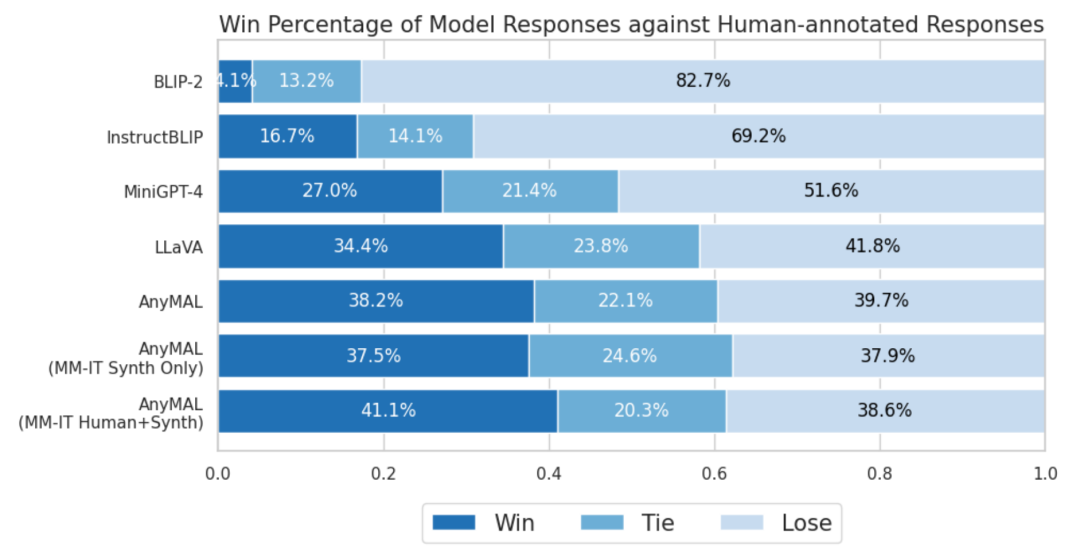 使用MM-IT数据集的多模态指令和真实答案对模型进行评估。AnyMAL在人类评估中展示了较小的与人类生成响应的差距,显示出与基线相比的竞争水平的视觉理解和推理能力。