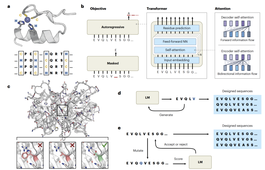随着高通量DNA测序技术的进步,我们能够从各种各样的来源收集到数十亿个蛋白质序列。观测到的蛋白质序列数量(数十亿)的增长速度已经超过了结构数据收集(数十万)的速率。随着我们观测到越来越多的蛋白质序列,我们可以开始识别出驱动进化过程的模式。从结构角度看,某些突变可能通过破坏α-螺旋、引入未满足的氢键或埋藏带电原子,对二级或三级结构造成较大的干扰。一般来说,这些突变并不完全受限,但一般对现有折叠的维持倾向足够强。从功能角度看,特定的氨基酸(或残基)必须布局协调,以执行蛋白质的生物学角色。例如,在锌指基序的情况下,几个残基必须存在并且正确定位,以绑定金属离子(图1a)。就像结构约束一样,这些功能布局的违反可能发生,并产生新的功能性。然而,这样的事件极为罕见,意味着我们通常会观察到关键功能位置很少变化,如果发生这样的变化,它们通常会被其他位置的变化所补偿,这些变化共同定义了功能布局。这些对蛋白质序列的软约束通常被称为共进化。研究人员利用这些共进化信息已经促进了蛋白质建模的进步,尤其是对于蛋白质结构预测。通过语言模型,我们旨在明确地模拟蛋白质中残基之间的相互依赖性。