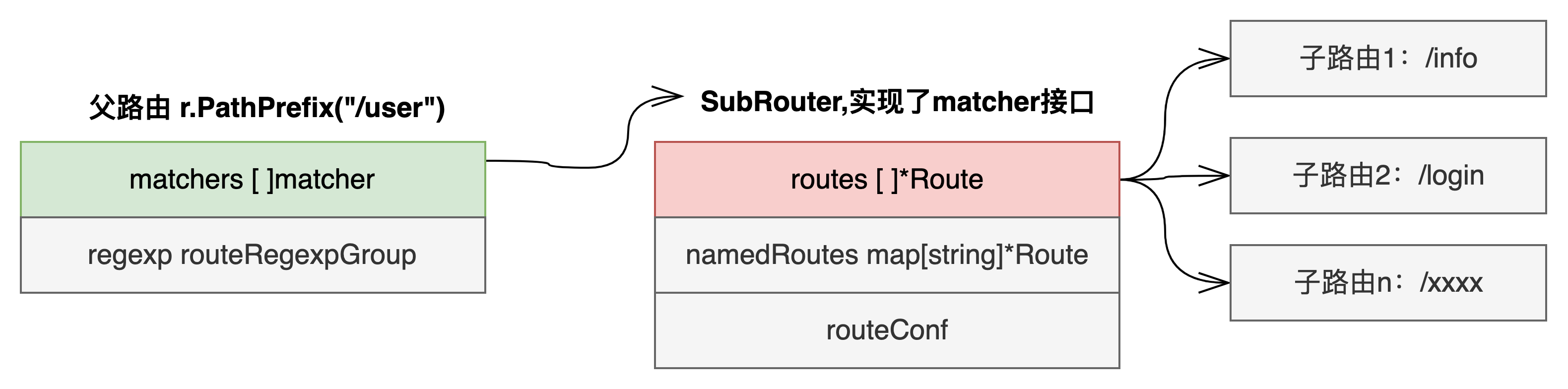 我们查看 Subrouter 函数的源码,实际上是新建了一个 Router 结构体,而 Router 结构体实现了 Match 函数,即 matcher,所以也会将该 matcher 加入到 r.PathPrefix 这个路由的 matchers 中。相当于在路由中有建了一个专属的路由表。以下是 Router 的 Match 函数实现,我们看到循环到该 matcher 时,循环子路由表的 routes,再对每个子路由依次进行匹配: