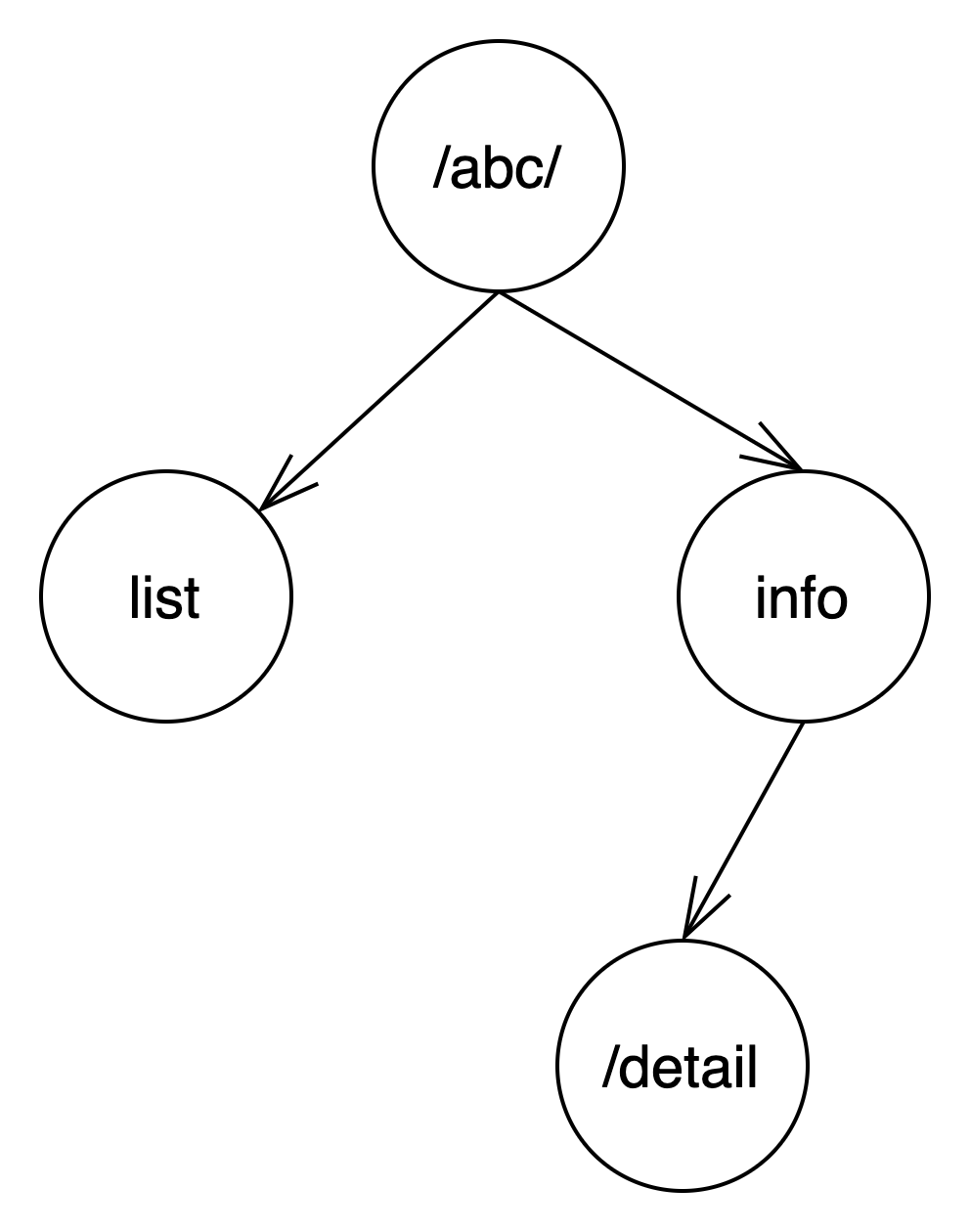 g.POST("/abc/list", ListHandler)这个路由的特点是和前两个路由有共同的前缀"/abc/“,所以首先会将现在的根节点进行拆分,拆分成”/abc/" 和"info"。而 info 和原来的"/abc/info/detail" 又有共同的前缀 info,所以原来的"/abc/info/detail"就变成了 info 的子节点。而"/abc/list"除去前缀"/abc/“后,剩余"list"子节点,作为”/abc/"的子节点。如下: