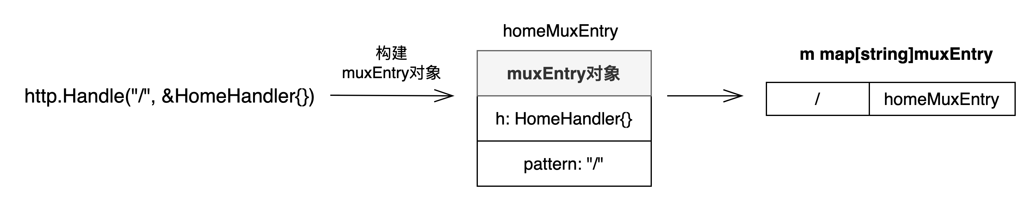 }pattern 是对应的路径,h 就是对应的处理函数。当我们调用http.Handle(“/”, &HomeHandler{})�进行路由注册时候,实质上就是将路径和 HomeHandler 对象构建成一个 muxEntry 对象,然后加入到 ServeMux 的 m 中。
