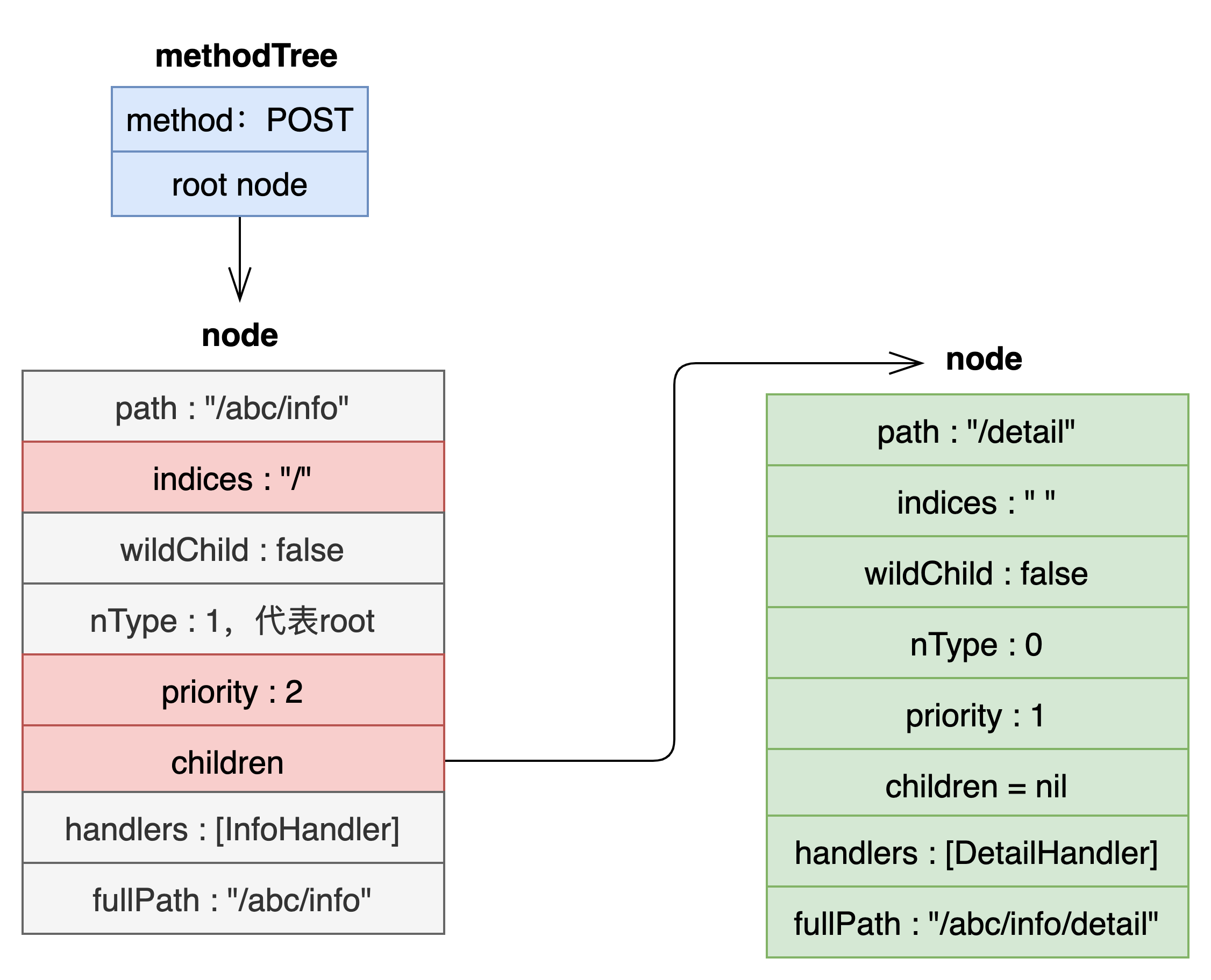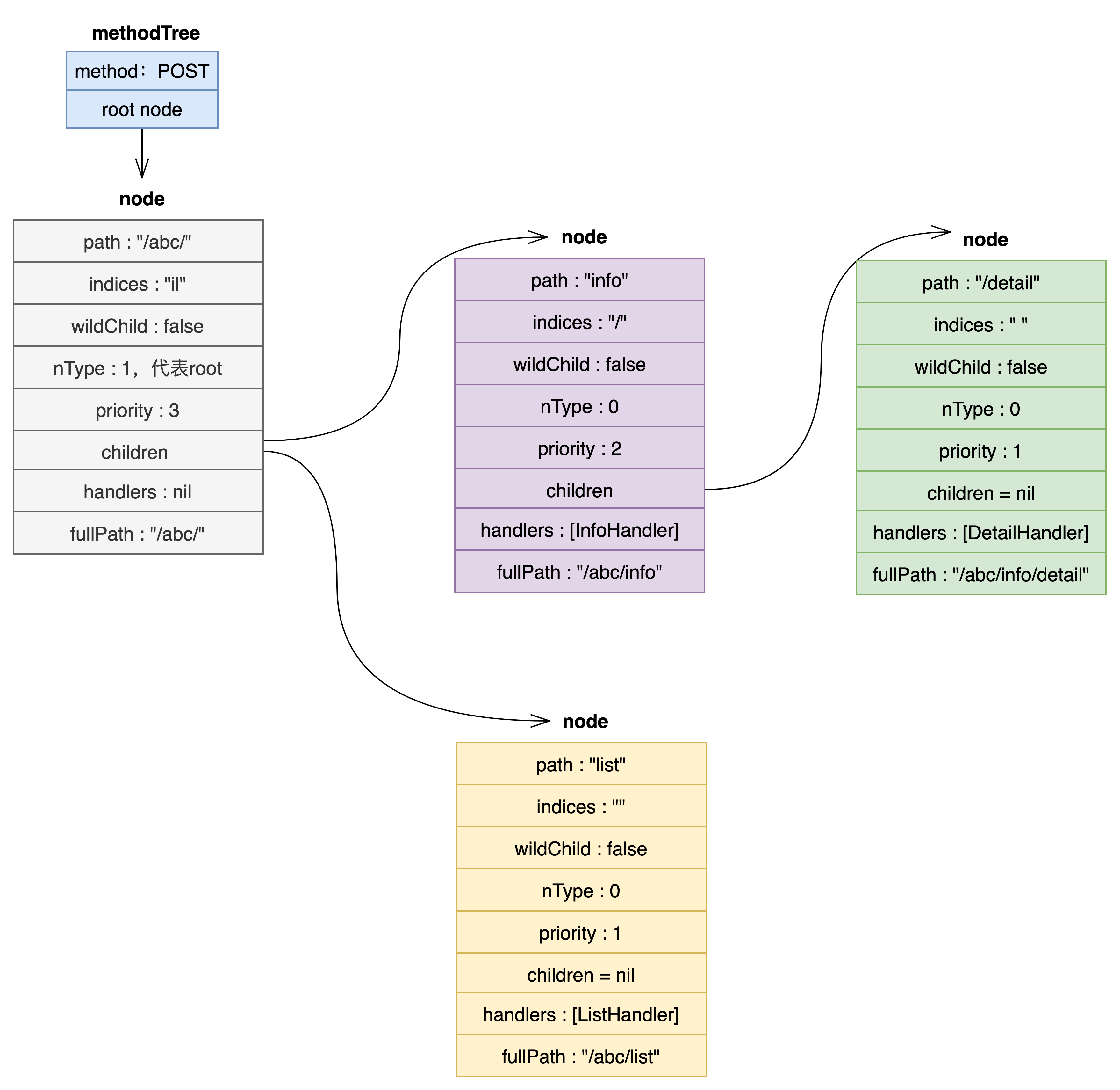g.POST("/abc/info/detail", DetailHandler)我们发现,这个路由的特点是和路由"/abc/info"有共同的前缀,所以会将该路由作为第一个路由的子节点放到 children 中。如下图: