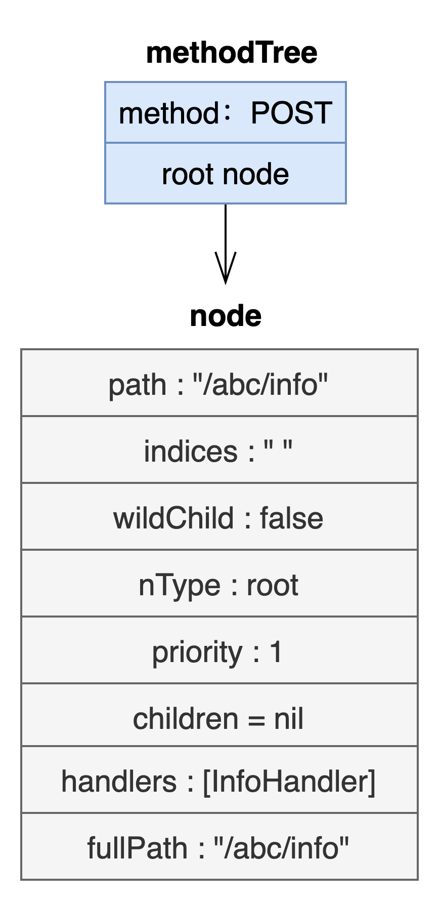 g.POST("/abc/info", InfoHandler)因为是第一个路由注册,路由树是空的。所以直接构建一个 node 节点,然后将该 node 节点作为 POST 方法路由树的根节点插入即可。如下图: