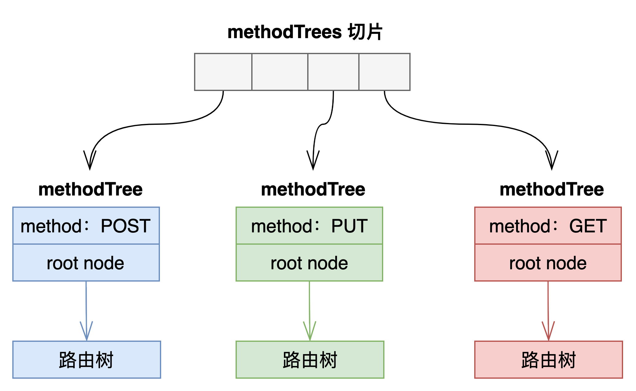 我们先看 gin 框架中的路由是如何对请求方法做限制的。 在 gin 框架中,路由树的构建是基于方法的。每种方法一棵路由树。如下: