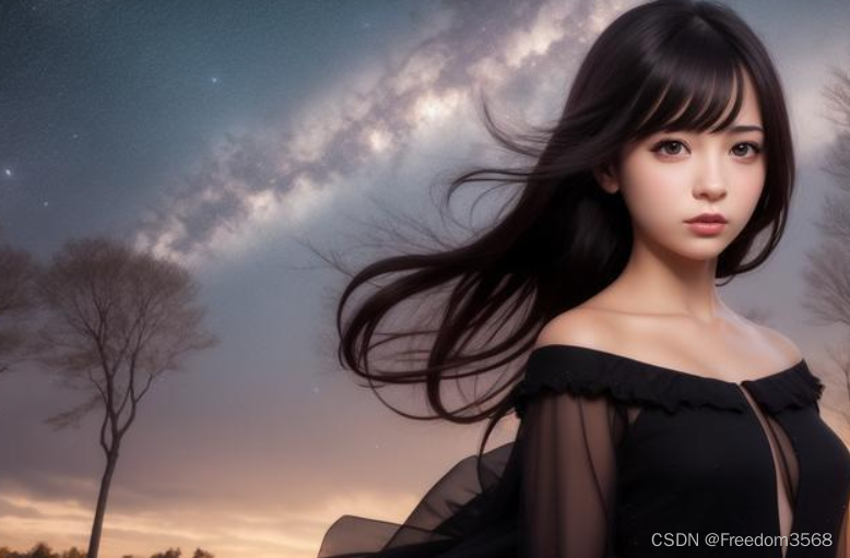 模型:Chilloutmix-Ni-pruned-fp32-fix 提示词:head portrait, realistic, 1girl, eyes, loli, lots of frills, black long dress, starry sky, black hair blowing in the wind, trees, bloom light effect 反向提示词:(low quality, worst quality, trembling, cropped face:1.4), cap, leg, (hand:1.6), nsfw 采样方法:Euler a Sampling steps:20 宽度和高度:1200×800 提示词相关性CFG:7.5 随机种子925943797