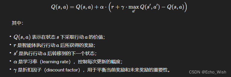 Q-learning是一种基于值函数的强化学习方法,用于学习在不同状态下采取不同行动的价值。它通过迭代地更新Q-value(行动-状态值函数),使得智能体可以根据当前状态选择最优的行动,并逐步优化策略以获得最大的累积奖励。