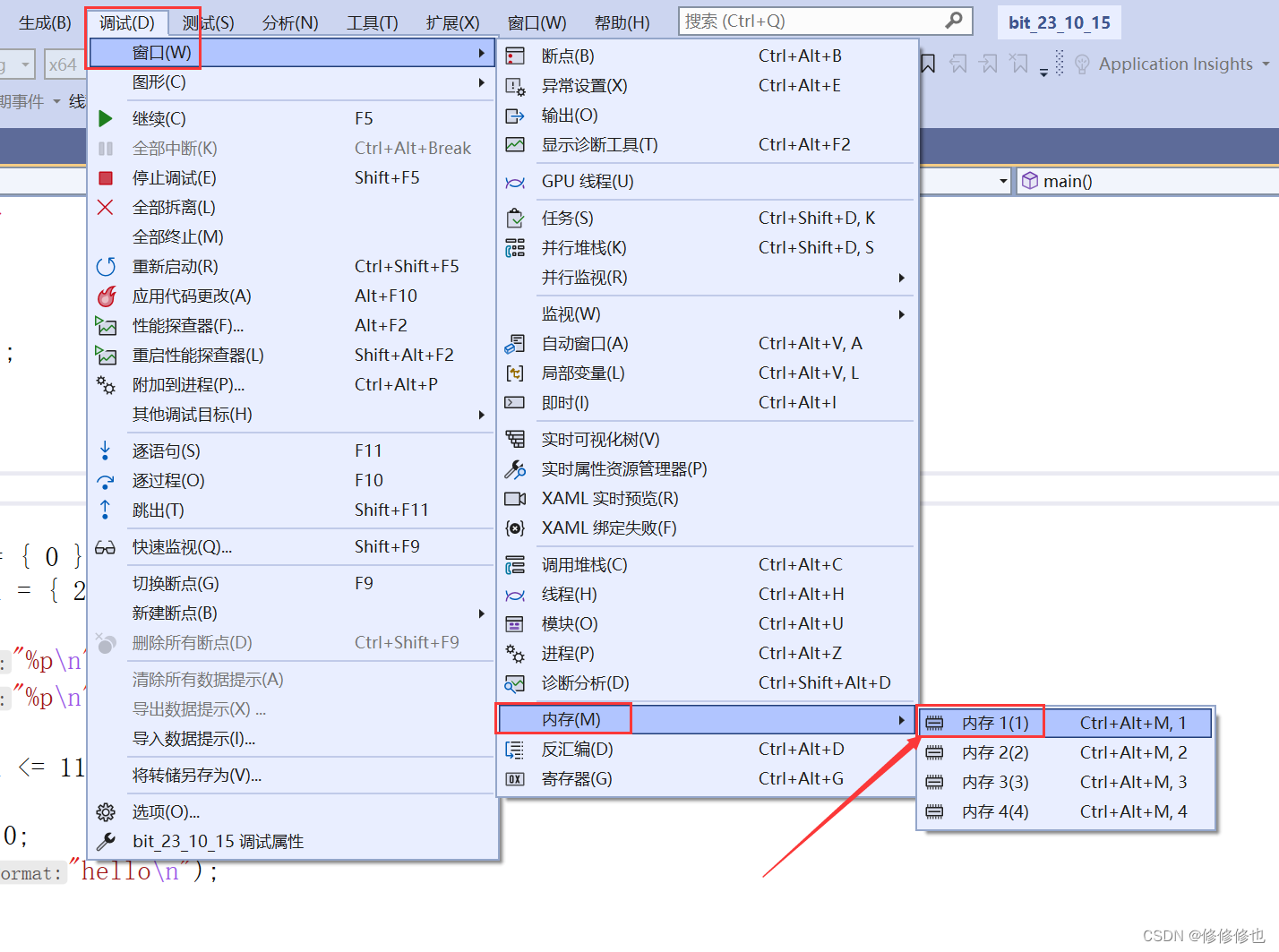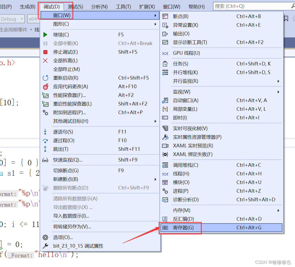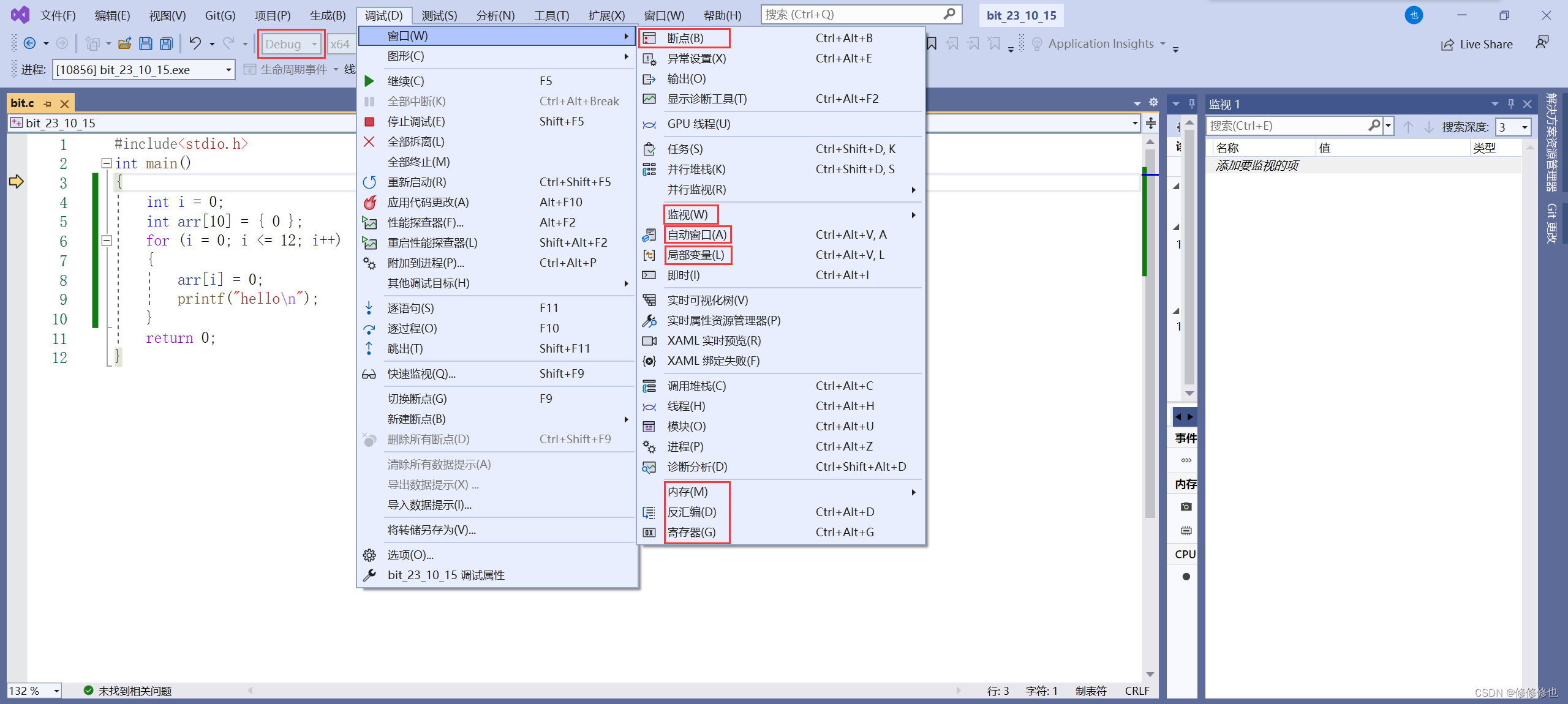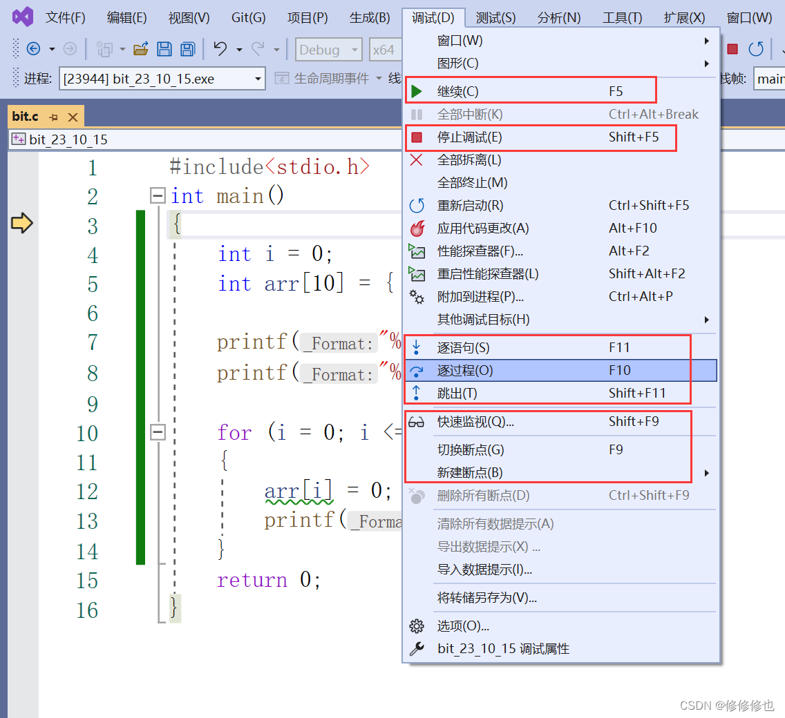 在vs2022中找到调试按钮,鼠标放上去就可以看到可以进行的操作及其快捷键.