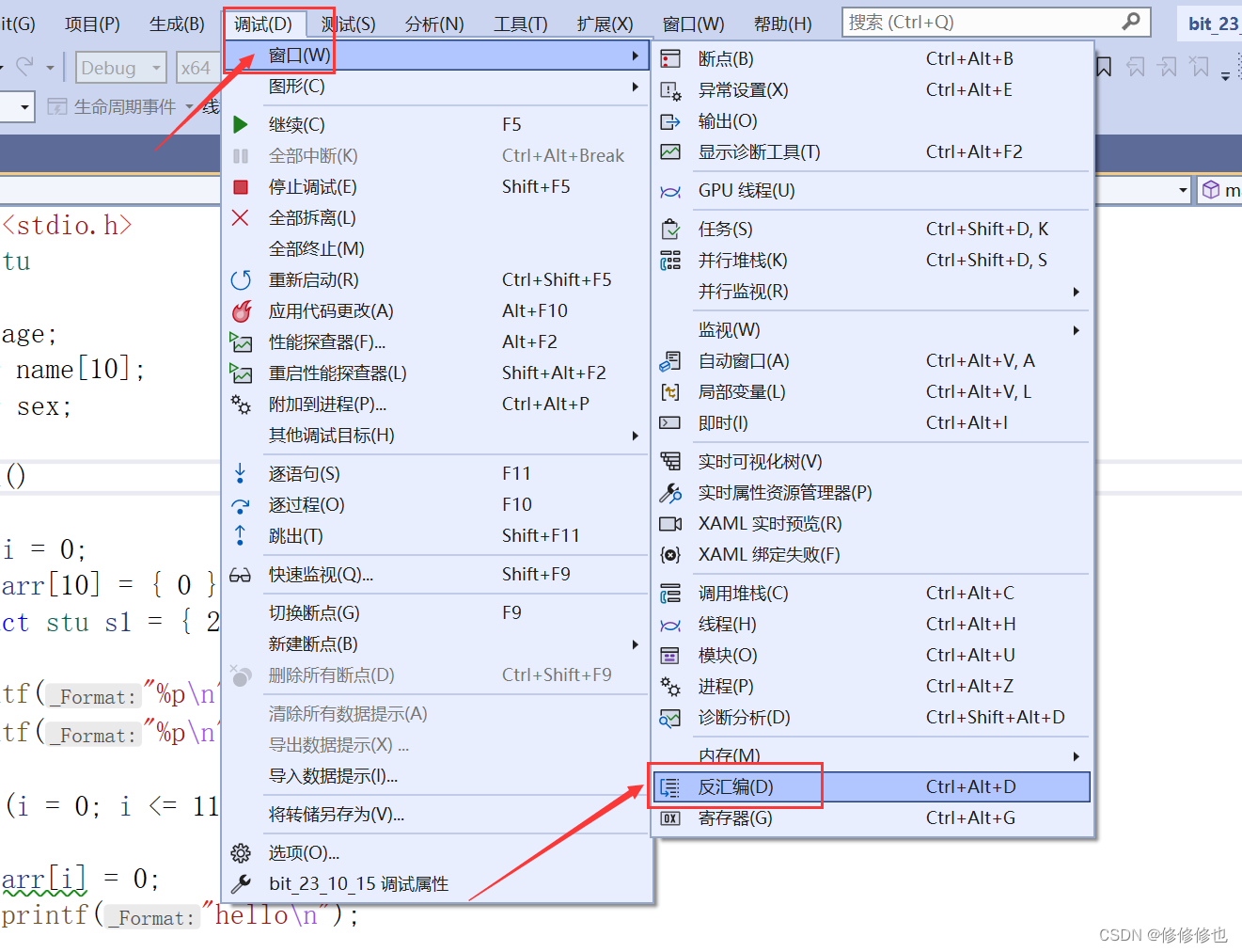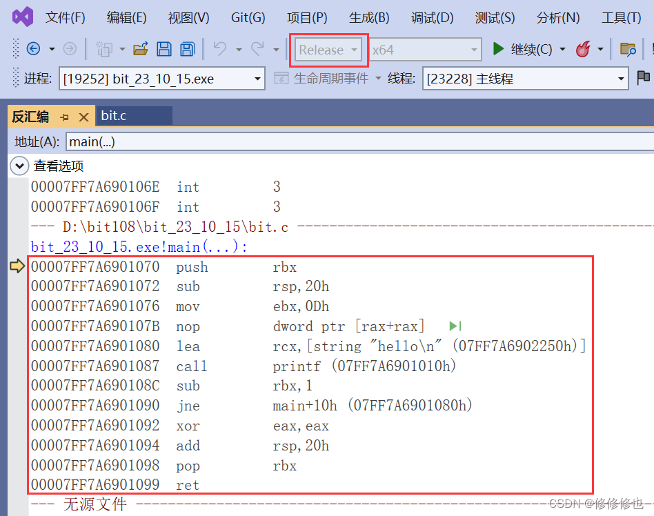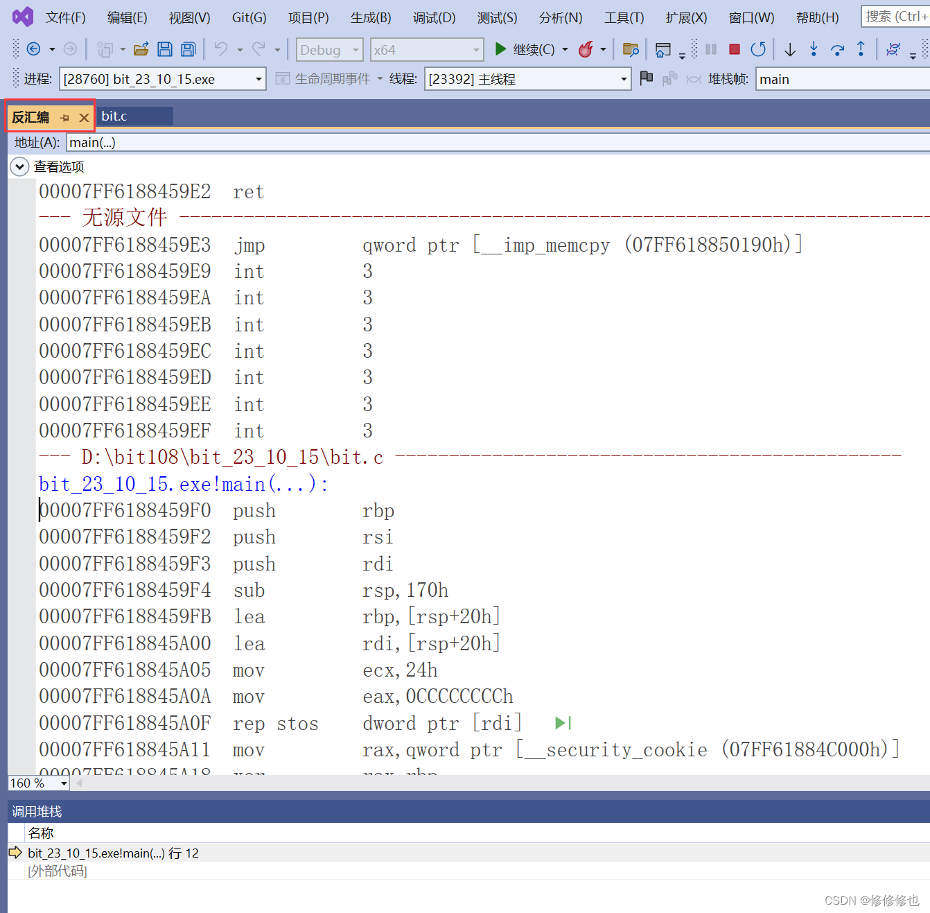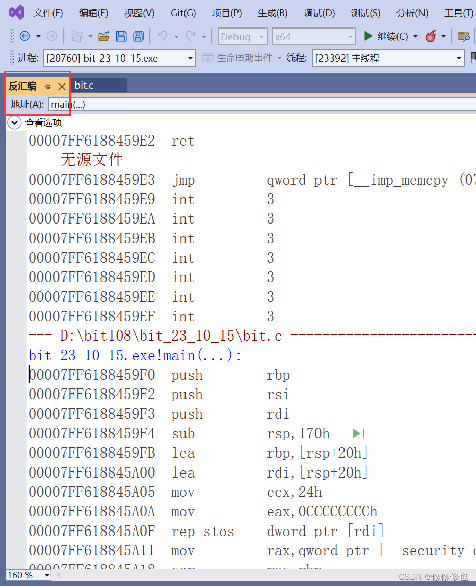 在调试开始之后,有两种方式转到汇编.