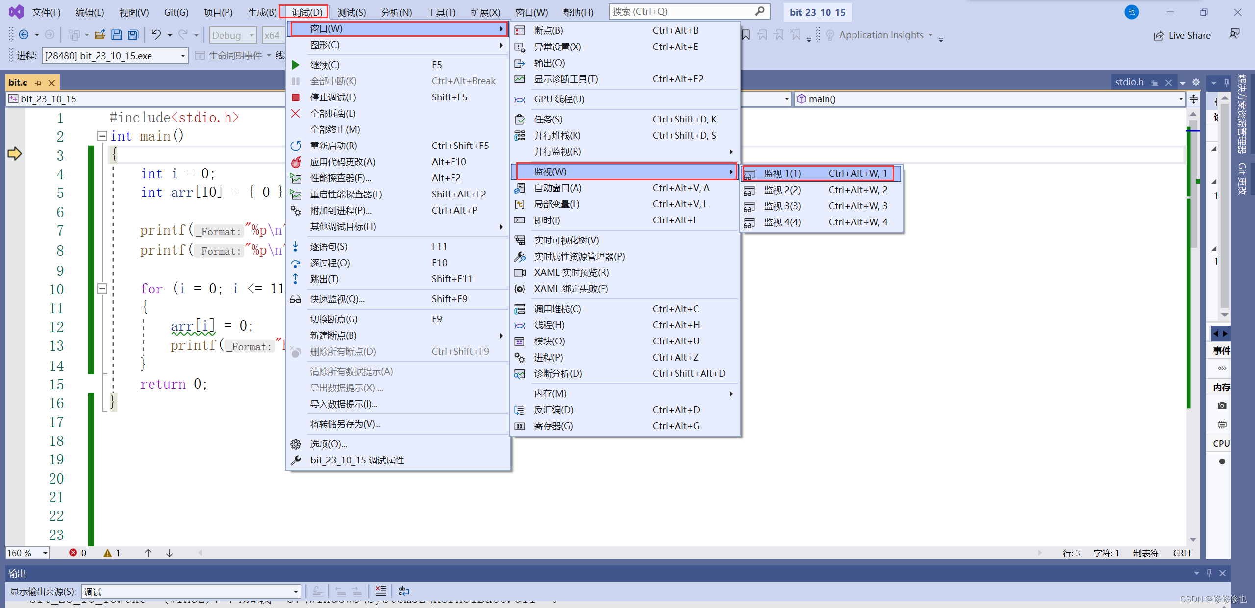 当我们需要观察临时变量的值时,可以先按下F10/F11进入调试,然后在调试中选择:调试-窗口-监视-监视1,就可以打开监视窗口了.