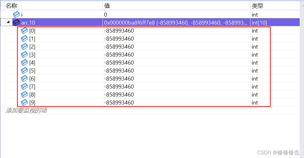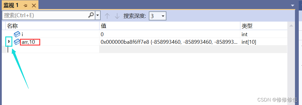 当我们需要观察数组中的成员时,可以输入"数组名,大小",然后点击旁边的小三角就可以一次性查看全部的数组成员了.