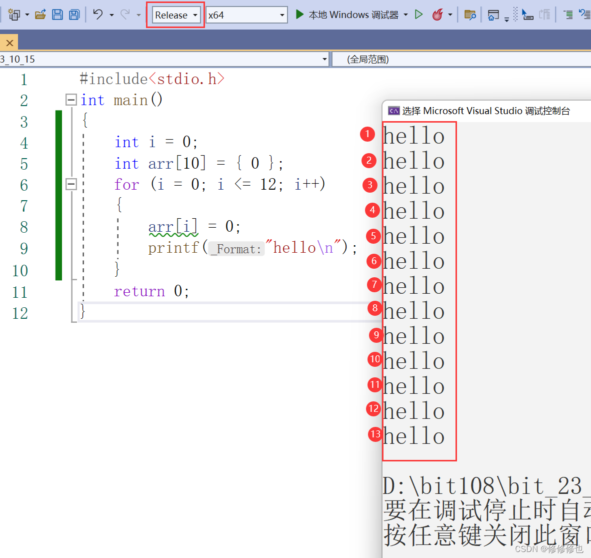 但在Release环境下却输出了13个"hello":