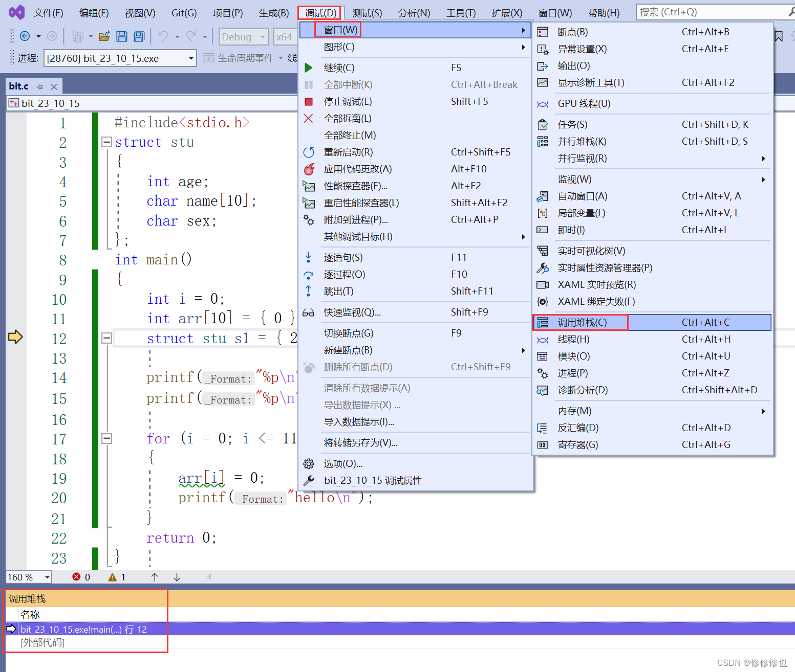 在Debug环境下,按F10(有fn键的话,需要按住fn+F10),启动调试,就可以使用如下功能了: