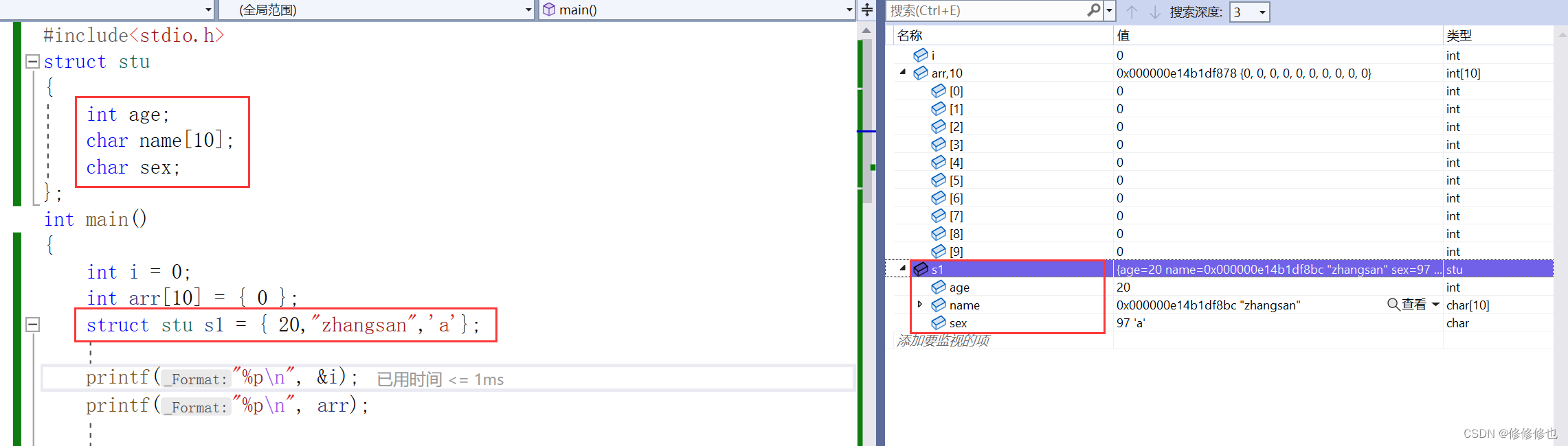当我们需要观察结构体中的成员时,可以输入结构体名,然后点击旁边的小三角就可以一次性查看全部的结构体成员了.