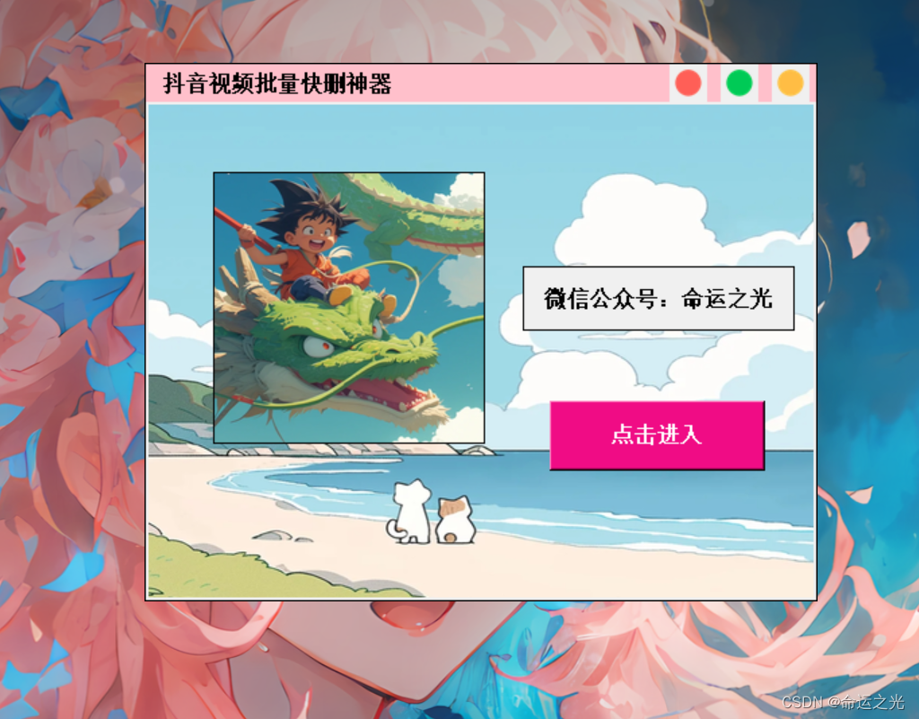title_label = tk.Label(title_bar, text='抖音视频批量快删神器', font=('宋体', 12, 'bold'), bg='pink', fg='black') # 设置标题文本背景色为黑色,文本颜色为白色