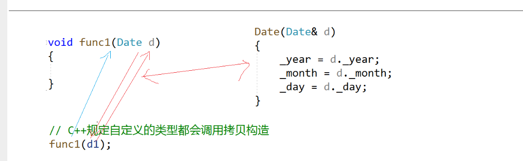 }构造两个函数,他们的参数不同,第一个函数为传值传参,在c语言中我们知道,传值传参是一个拷贝的过程,即把d1的值拷贝给d,c++规定,自定义类型的拷贝,都会调用拷贝构造
