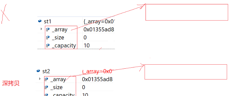 当通过 Stack s2(s1); 这样的语句创建一个 Stack 类的对象时,如果没有显式定义拷贝构造函数,C++ 编译器会提供一个默认的拷贝构造函数,它进行浅拷贝。这意味着 _array 指针的值被复制过来,但指向的内存空间没有被复制。这会导致多个对象共享同一块内存空间,进而导致双重释放等问题