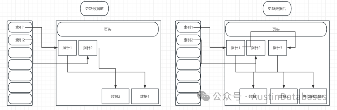 因这样的方式仅仅变动的是业内的指针重定向,所以这个样的方式相对于修改索引1的指针指向指针3 要方便的多,节省了大量的数据处理的资源。