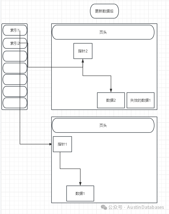 那么说到这里,如果要满足这样的操作必须保证更新后的行和被更新的行在一个页面内,才可以进行此操作,如果是下面的情况那么HOT无法进行工作的,下图展示的是由于原有更新行的数据并为插入到原有的数据页面中,而是插入到了新的页面中,所以索引必须指向新的位置,而不能再指向原有的页面了。