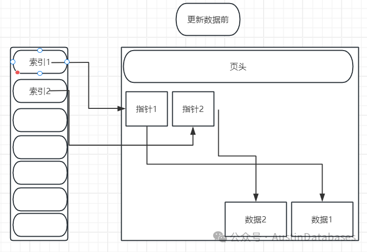 为了解决这个问题,提出了HOT heap-Only-Tuples , 通过这样的方式来减少在进行数据行的更新后,新的索引行的产生情况。我这里大致画一个简图来说明这样操作后的好处是什么。