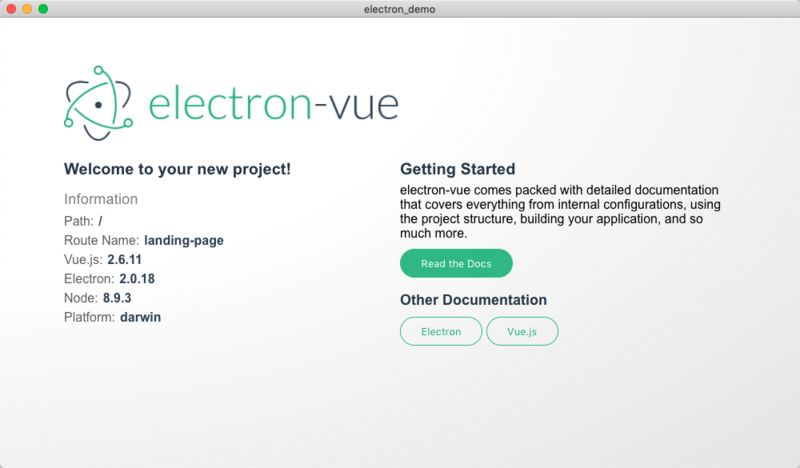 然后,使用 npm install 命令安装项目所需要的依赖包,安装完成之后,可以使用 npm run dev 或 npm run build 命令运行 electron-vue 模版应用程序,运行效果如下图所示。