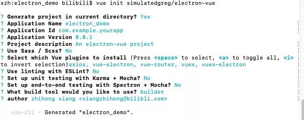 vue init simulatedgreg/electron-vue然后根据下面的提示一步步选中选项即可创建项目,如下所示。