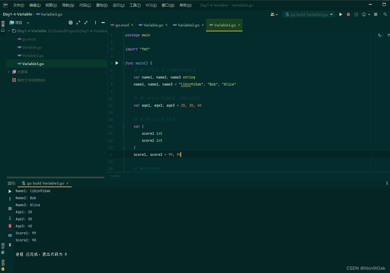 var name = value第三种,省略var, 注意 :=左侧的变量不应该是已经声明过的(多个变量同时声明时,至少保证一个是新变量),否则会导致编译错误(简短声明)