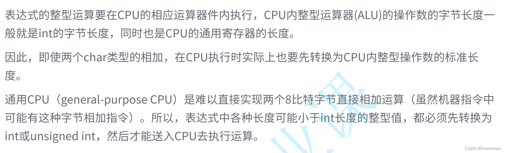 所以在整数类型运算中,都是转换为4个字节的数据再去算,这也能很好解释两个字符在运算前要转换为int类型再去算。