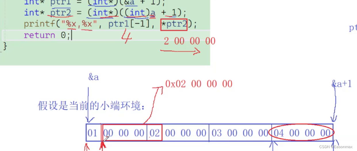 第二个有点考虑理解,首先前提我们是x86环境,内存为4个字节,所以在转换为int后将其由地址形式转换为整形,从而加一是真正使其数值加一,而后将其再转换为地址就是指向下一个字节。从而如下图就是打印出2000000(十六进制形式),(前提还需要系统为小端存储模式)