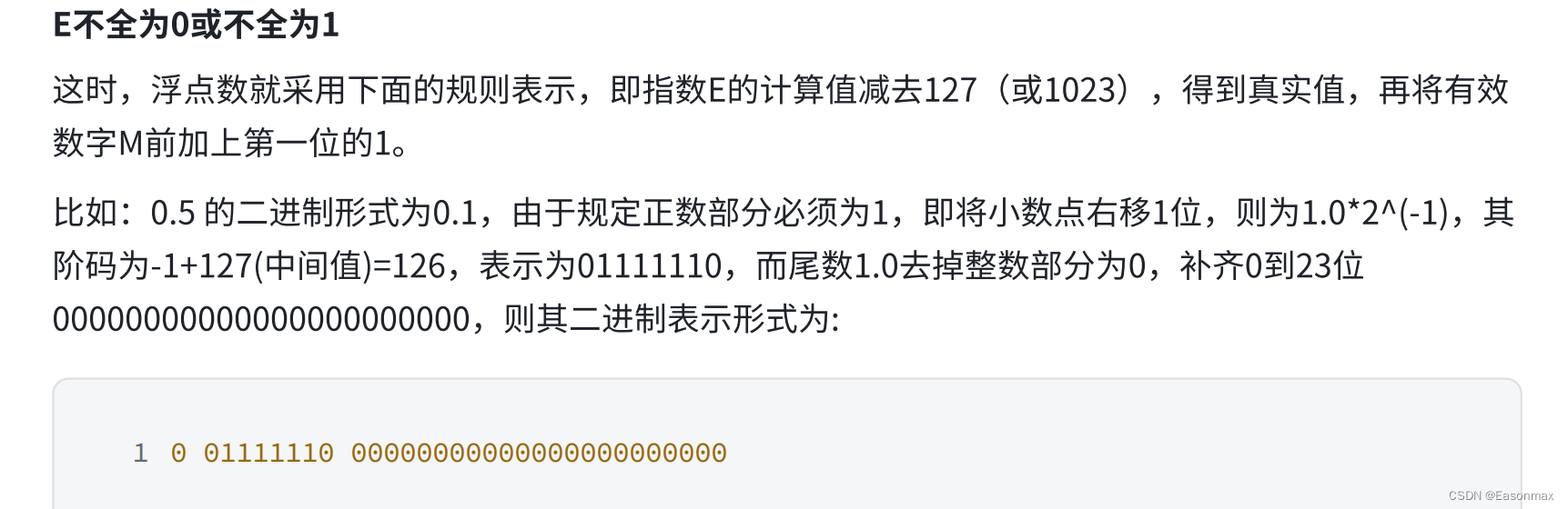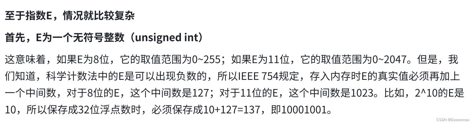 当E全为1时,此时指数为128,所以此时其数字大小非常大。(其取的过程符合平常取的步骤)