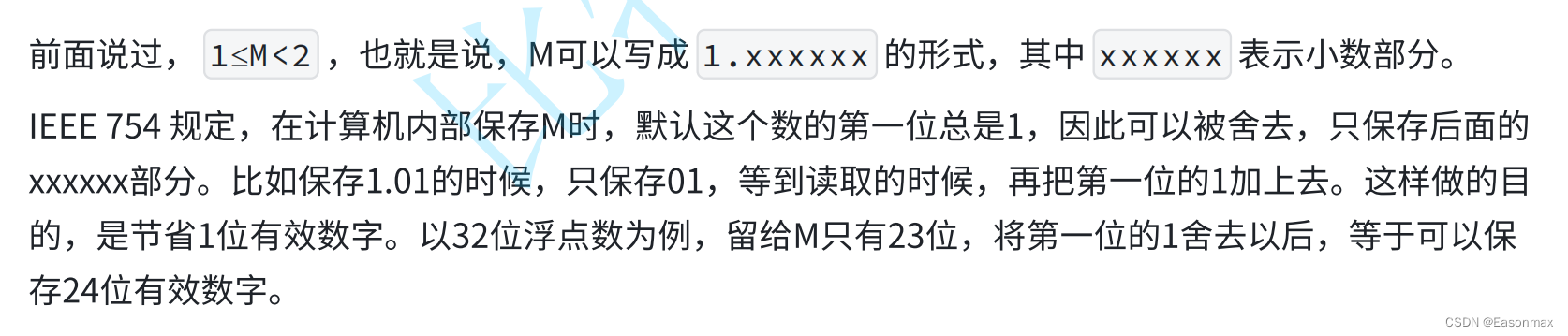 对于M,由于其1=<M<2,所以其整数部分绝对默认都是1,从而可以在存入时省略1,只存入小数部分,到读取时再取出来,从而节省了一位有效数字,使其更加精确。