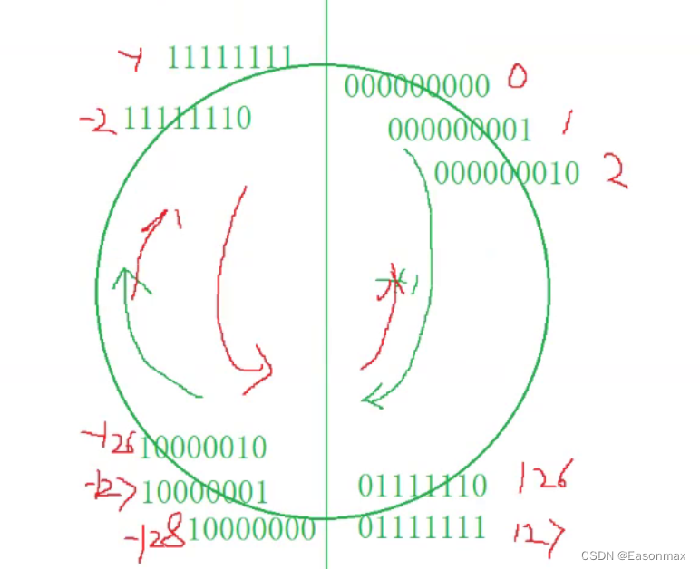 当使其等于的值超过范围时,就会隐式转换从而变为符合其范围的值,且该范围的值符合一个循环(可以理解为圆圈)