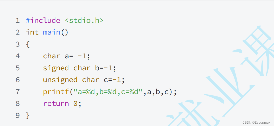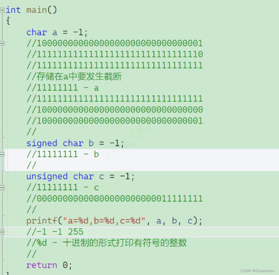 上面该图是其中具体细节变化,因为a是有符号,在截断后内存存放为11111111,a和b都是有符号的,printf存储是以四个字节存储,所以整形提升为11111111111111111111111111111111,%d是打印有符号的整数,其本身就是有符号整数,无需任何变化。