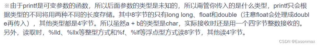 printf具体机制是当数据为除float类型外的浮点型或者long long类型时存储的字节大小是8个,其他都为4个。(上图说错了,float类型是存储四个字节,不是八个)而后根据占位符作用再对存储的数据再进行变化。(printf是库函数,内部太复杂) (像你用了%d,后面参数是 unsigned char类型,先会将其变为四个字节(还是无符号,只改变其所占字节大小),然后因为%d是打印有符号整数,所以再将其变为有符号,从而打印出其对应十进制)(之后的练习例题中会用到)