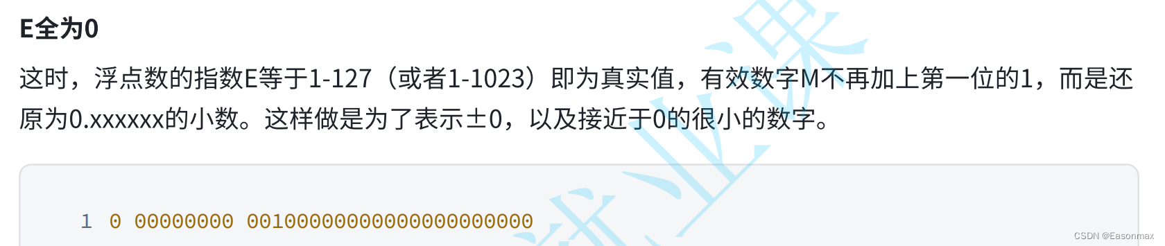 当E全为0时 有效数字的被忽略的整数部分不为1,而为0,且指数E为1-127(-126),所以为无限接近0的小数。(此时取的过程步骤不符合平常取的步骤)