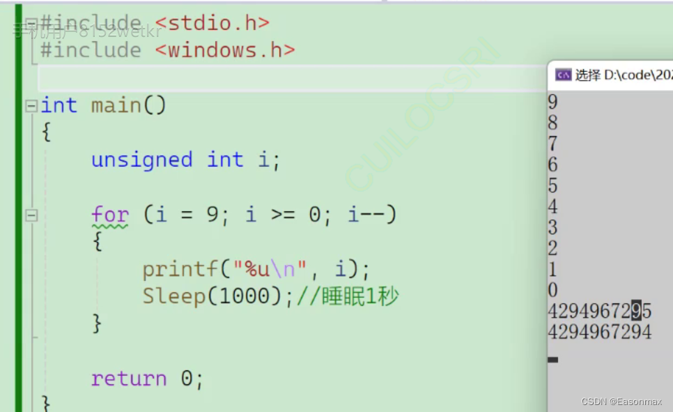 第二个结果为死循环打印。如下图(不只是打印这些,后面还会死循环打印4294967293等等),因为变为0之后减1由于为无符号且有一定范围所以减一变为最大429496795.从而死循环