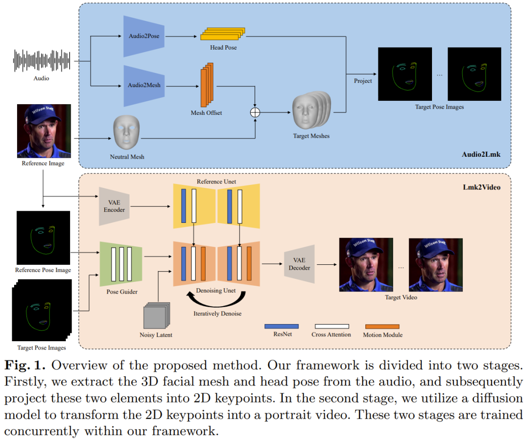 腾讯新提出的 AniPortrait 框架包含两个模块:Audio2Lmk 和 Lmk2Video。